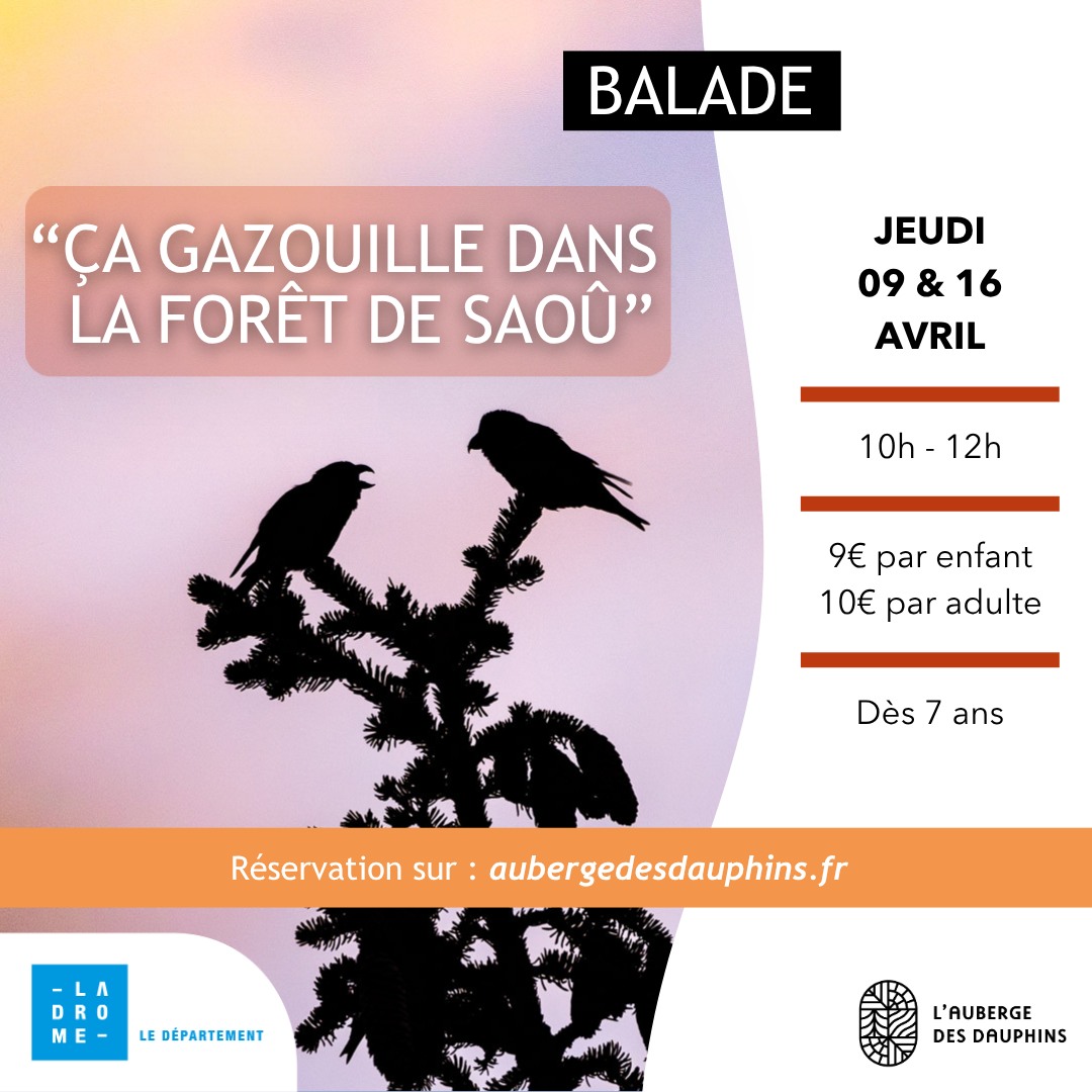 Dès les premières lueurs du jour, la forêt s’éveille en musique. Jumelles autour du cou, partez en famille pour une balade immersive à la rencontre des habitants ailés de Saoû. Apprenez à les identifier et comprendre leurs comportements. Au détour des sentiers, la LPO vous en dira plus sur le rôle du chant, la prouesse de la migration ou encore la magie de la parade nuptiale. A chaque halte de cette balade, vous explorerez l’épopée d’un oiseau au fil des saisons grâce à des activités ludiques !