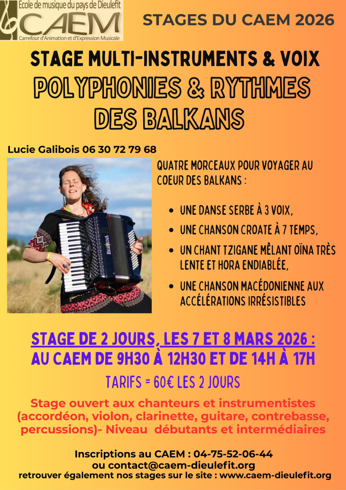 Stage ouvert aux chanteurs et instrumentistes (accordéon, violon, clarinette, guitare, contrebasse, percussions)