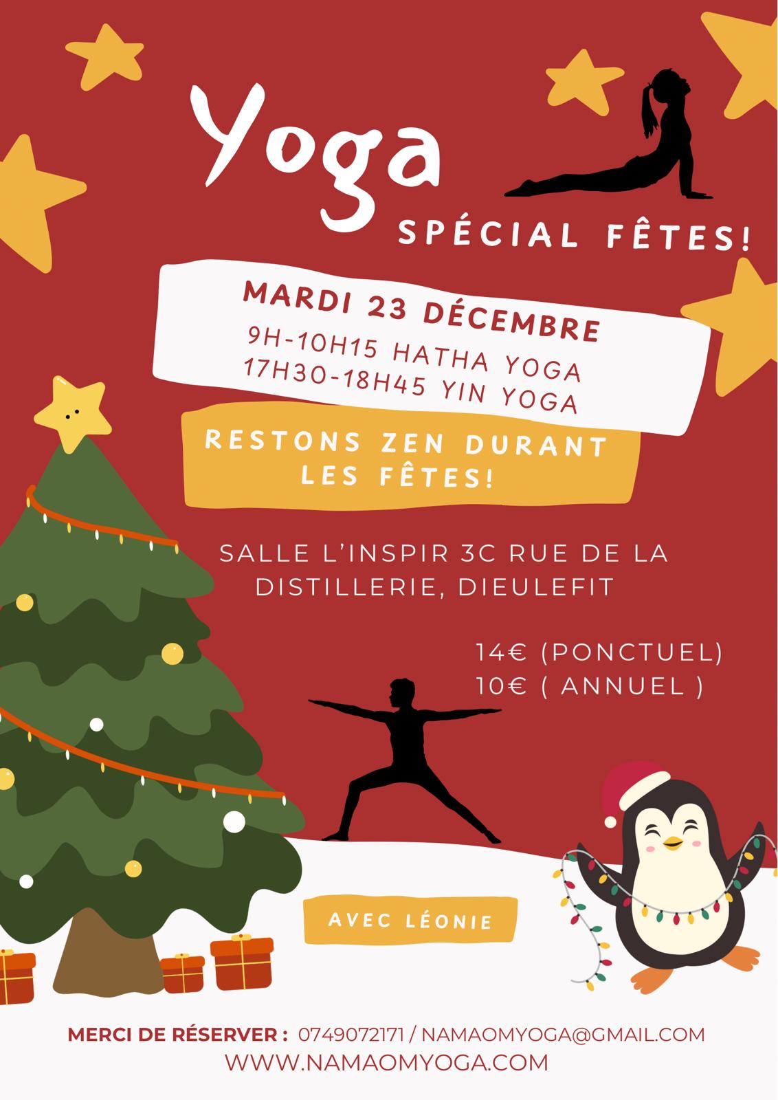 Yoga adultes spécial fêtes pour rester zen au repas de Noël Un moment de détente pour ce faire du bien au corps et au cœur, ouvert à tous.