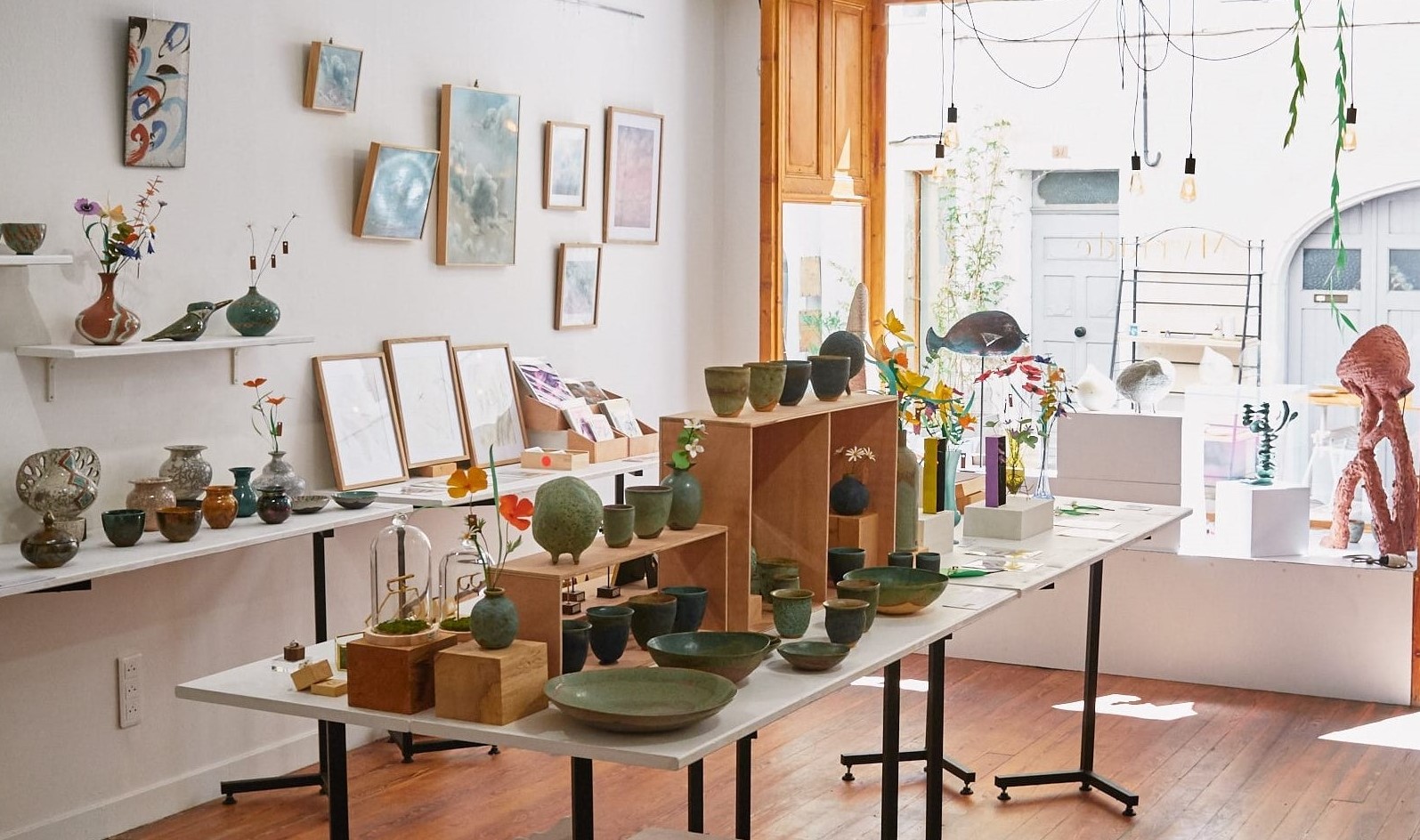 Myriade boutique collective d'artistes et d'artisans d'art de la région. Présentation de céramique, peinture, sculpture, photographie, bijoux, créations papier