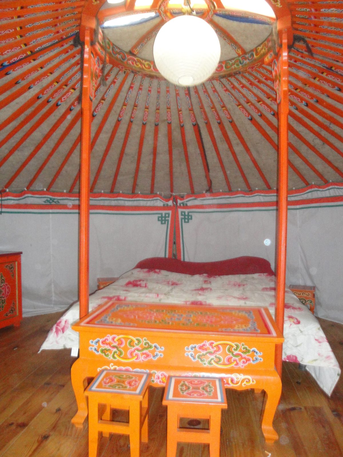 Eine echte mongolische Jurte für 4 Personen auf einem Naturcampingplatz (25 Stellplätze) von 4 Hektar in einem Eichenwald. 4 Betten in 90 cm Breite mit Bettwäsche und Kopfkissen, eine separate Kochecke, Tisch und Stühle.