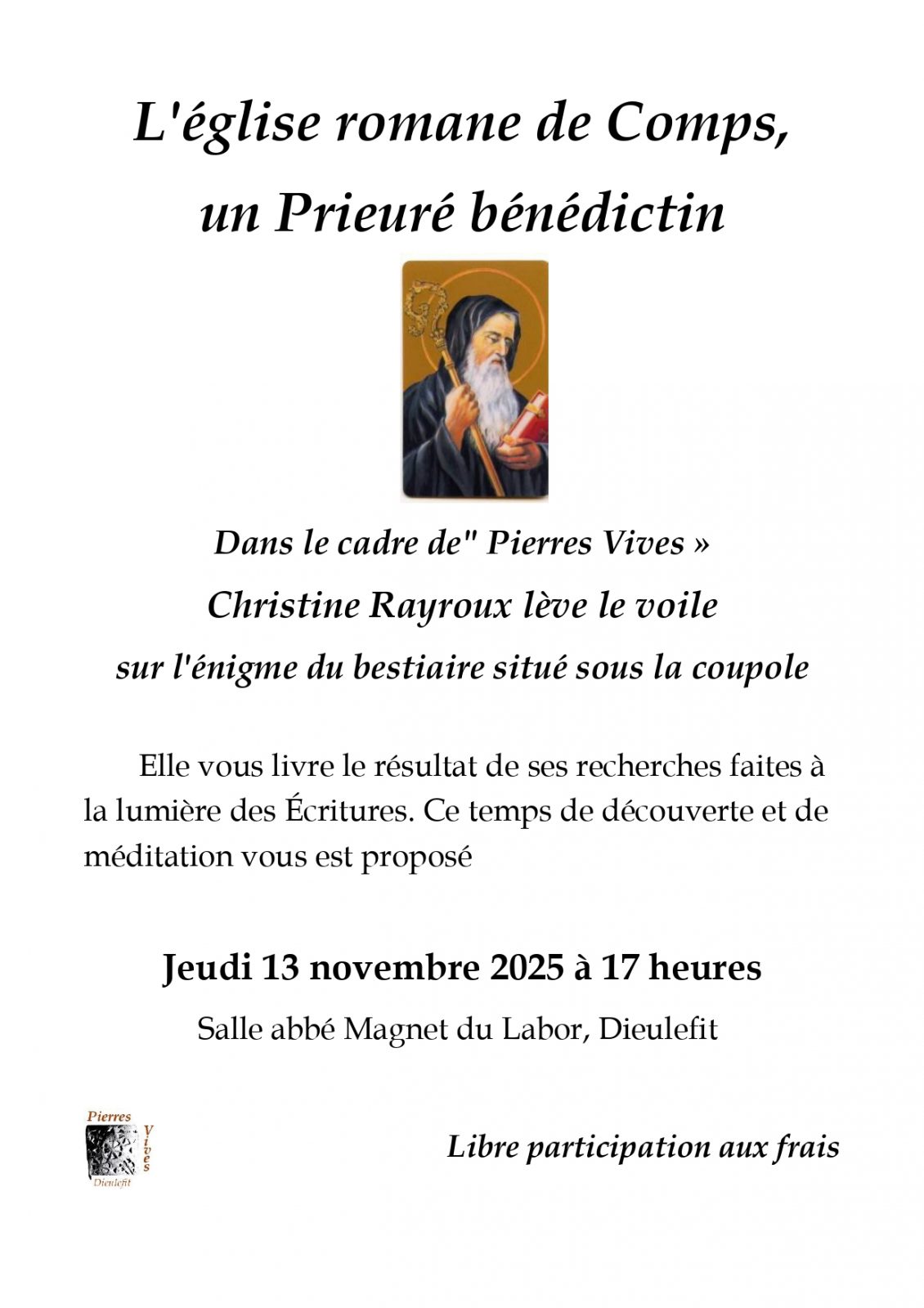 Empfang https://www.dieulefit-tourisme.com/de › Ihr Aufenthalt Ihr Aufenthalt › Termine Termine › Ereignisse Ereignisse › Conférence sur le Prieuré bénédictin de l’église de Comps