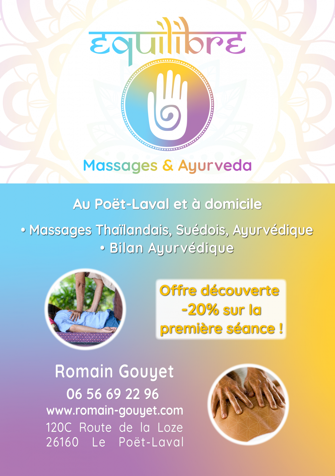 Empfang https://www.dieulefit-tourisme.com/de › Praktisches Praktisches › Geschäfte und Dienstleistungen Geschäfte und Dienstleistungen › Equilibre Massages & Ayurveda