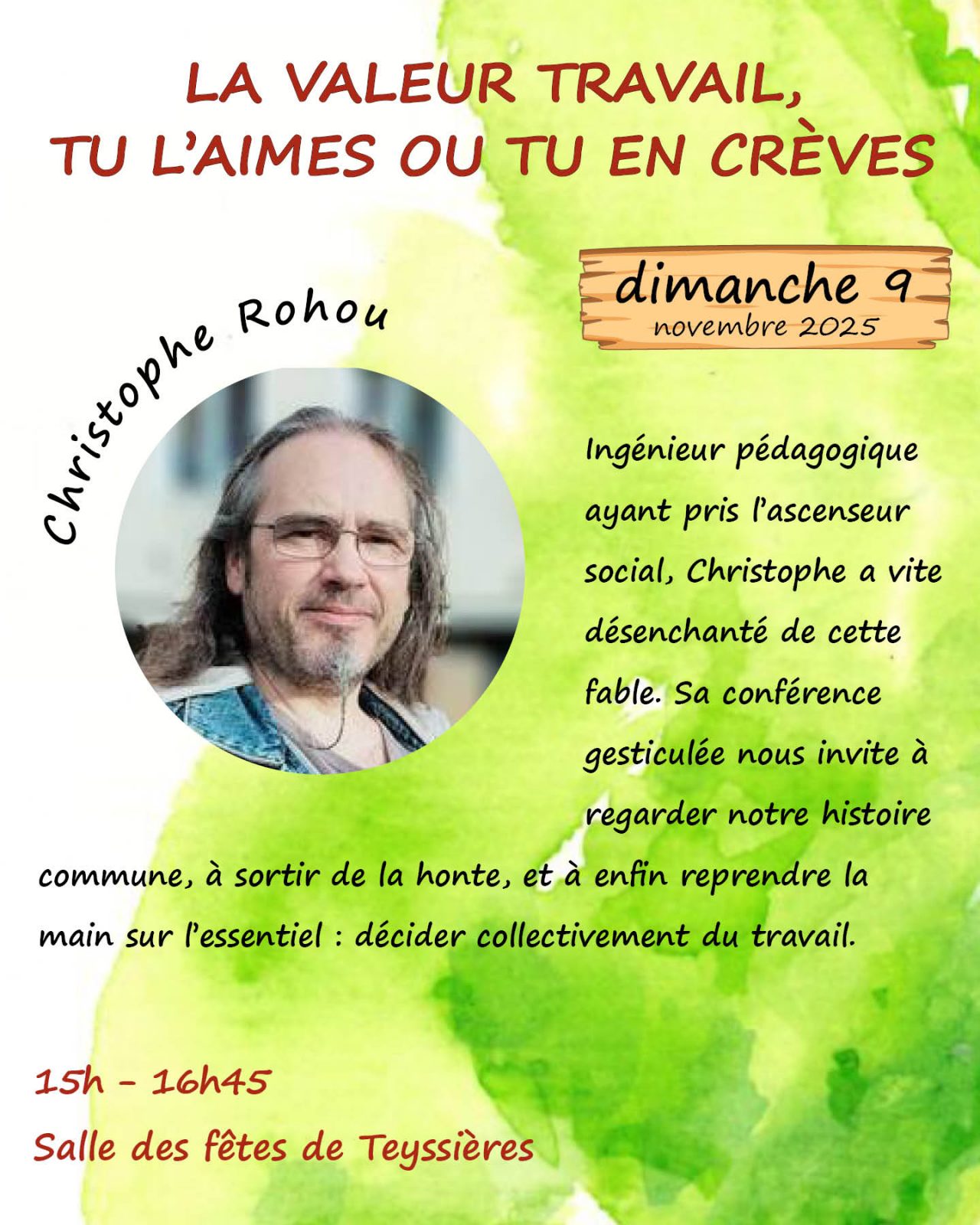 Home Page https://www.dieulefit-tourisme.com/en › Plan your trip Plan your trip › Calendar Calendar › Events Events › La valeur travail, tu l’aimes ou tu en crève – Conférence gesticulée