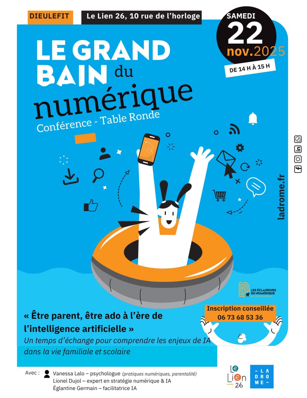 L'événement "Le grand bain du numérique" est organisé par le Département de la Drôme. Il se déroule à Valence et comprendra une conférence sur l'intelligence artificielle (IA). Cette conférence sera retransmise en direct au lien numéro 26.