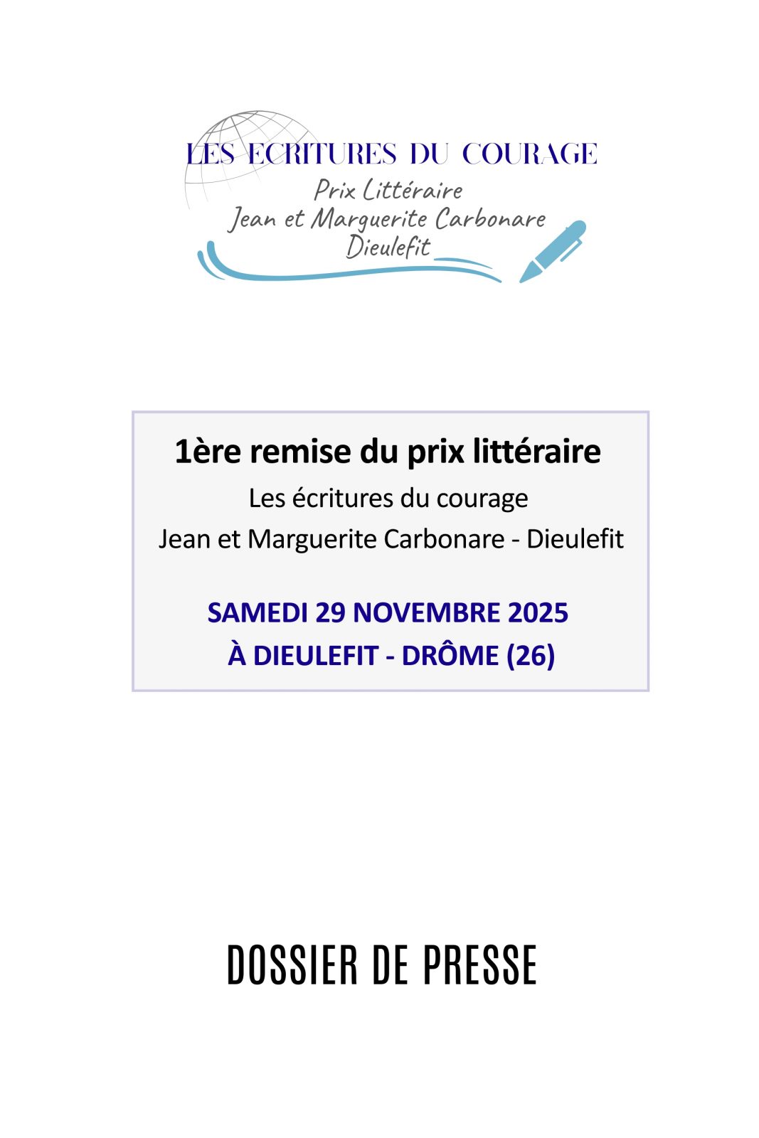 Home https://www.dieulefit-tourisme.com/nl › Uw verblijf Uw verblijf › Agenda Agenda › Evenementen Evenementen › 1ère remise du prix littéraire ‘Les écritures du courage – Jean et Marguerite Carbonare – Dieulefit’